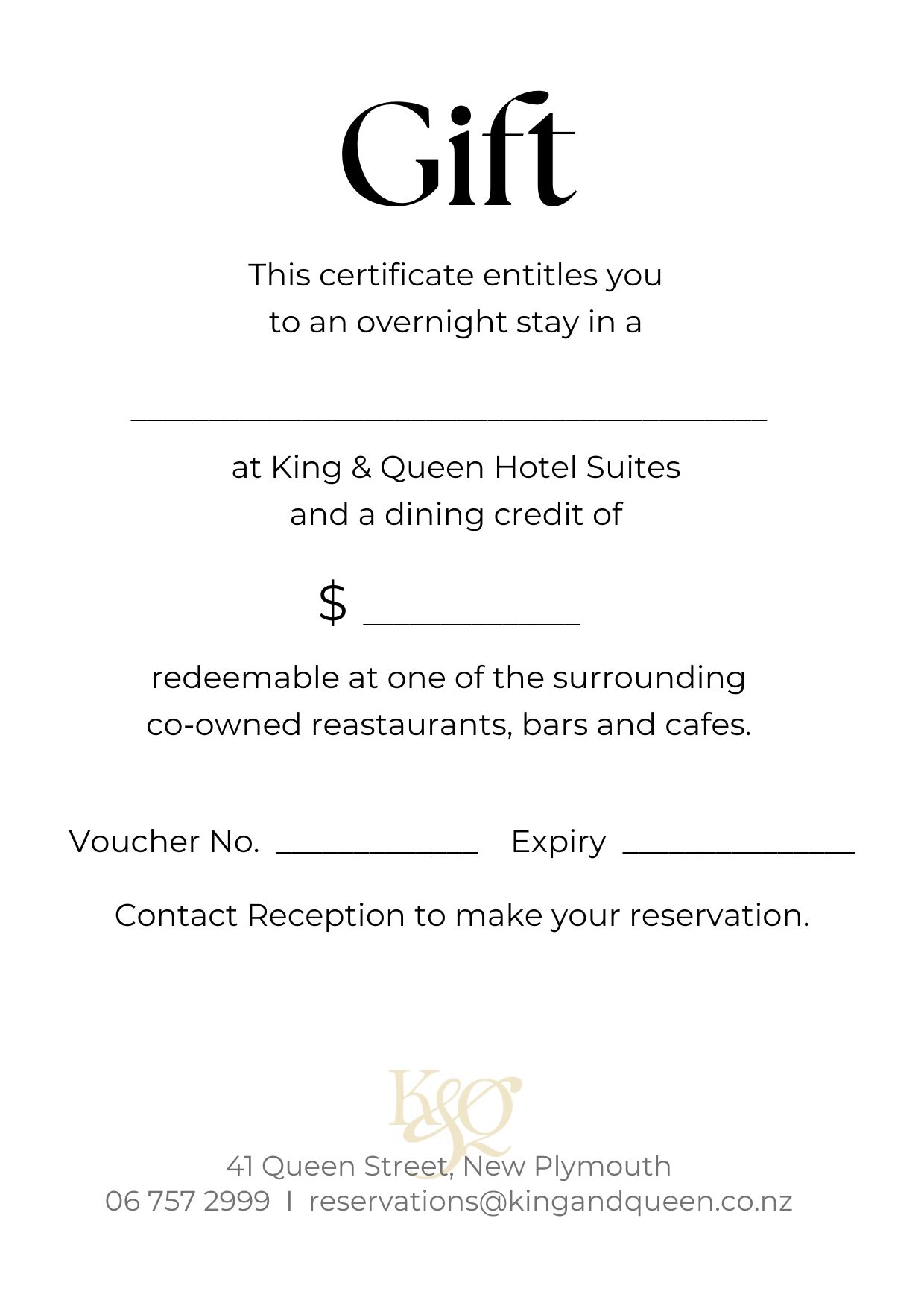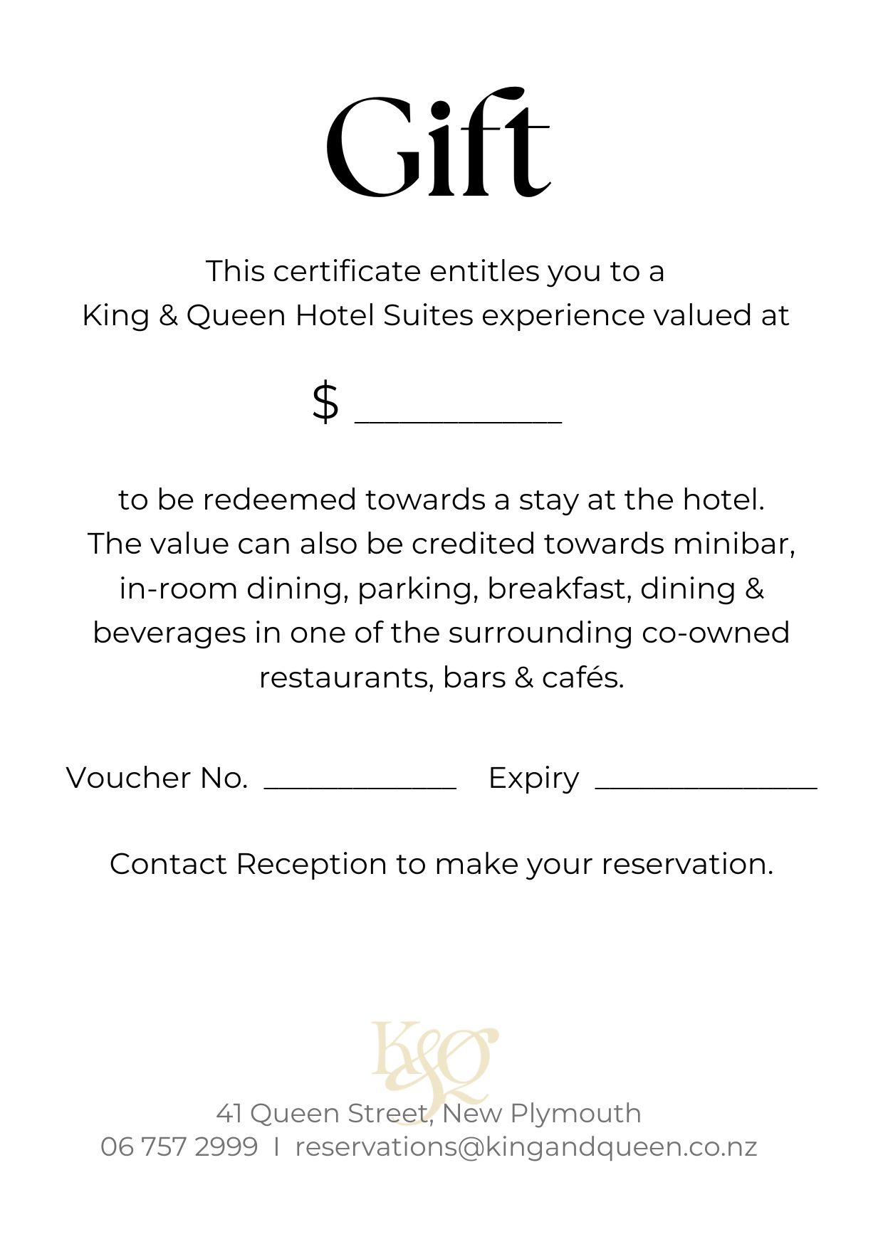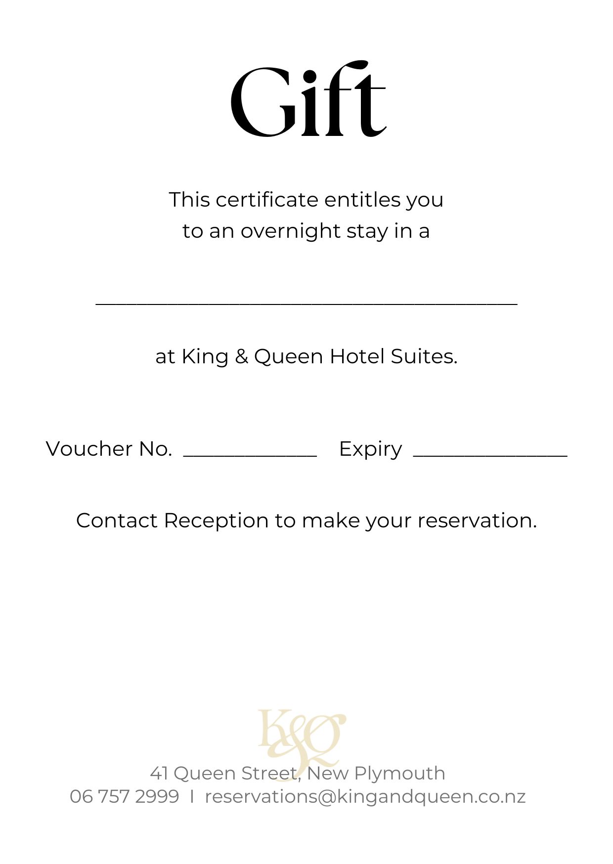 Treat that special someone with a gift voucher for memorable moments at King & Queen Hotel Suites. Just send us an email, pop in or give us a call (reservations@kingandqueen.co.nz or 06 7572999).